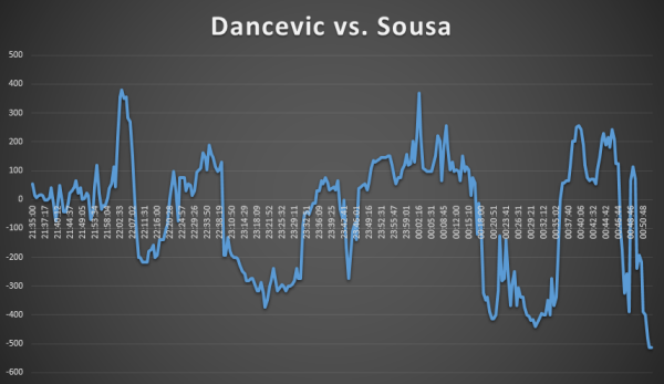 Dancevic started the match at odds of 3.02/1 and Sousa at 1.51/2. You can see that on at least four occasions the odds tipped significantly in favour of Dancevic and you could have cashed out for a really good profit.